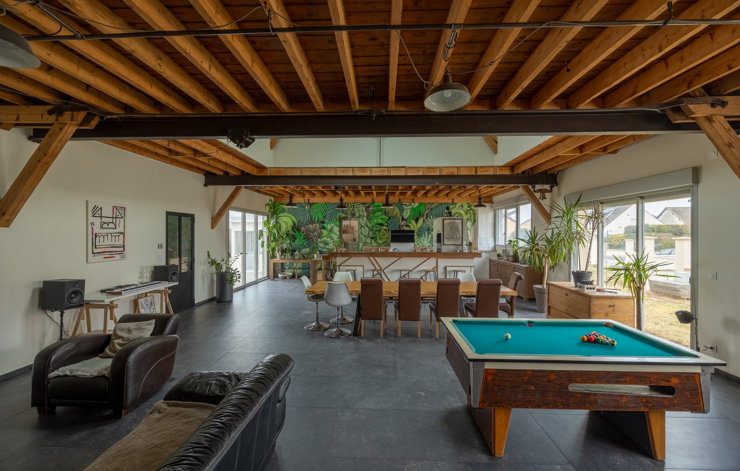 La pièce de vie de 110m² avec cuisine ouverte s'étend devant vous telle une vaste halle d'atelier.